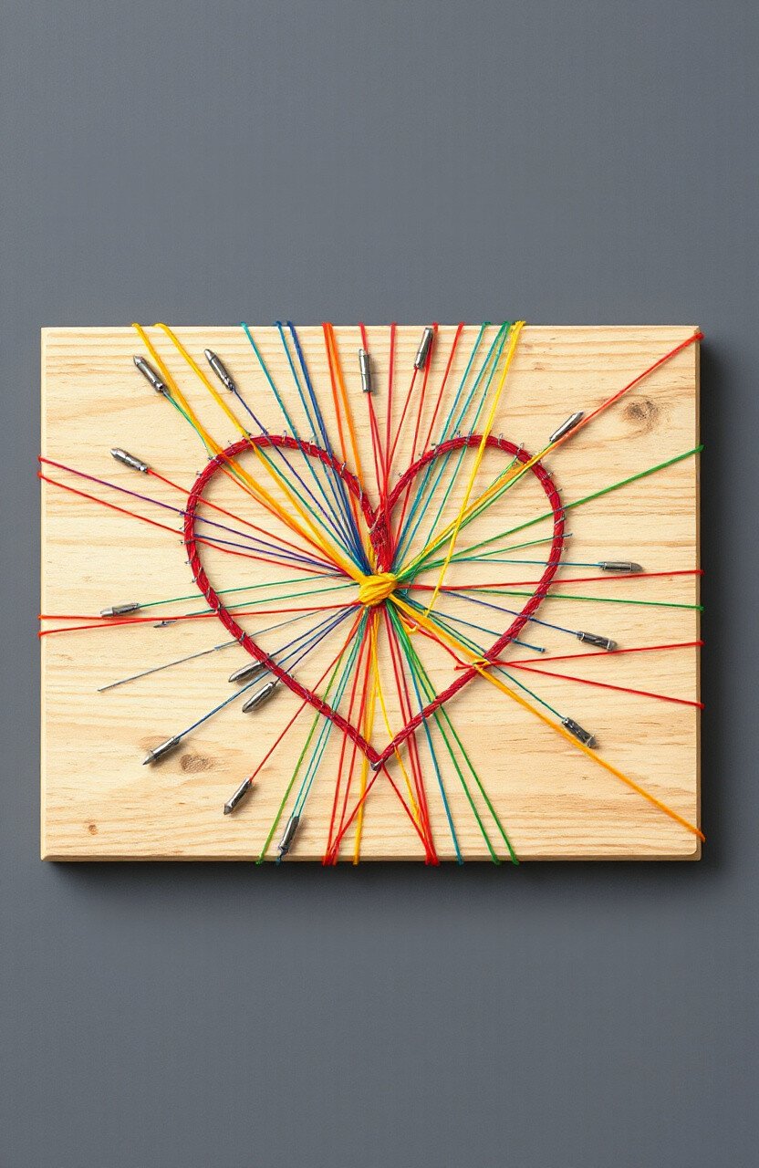 Create stunning designs using nails and colorful string. Hammer nails into a wooden board to form a shape, then wrap string around the nails. The result is a striking piece of art.