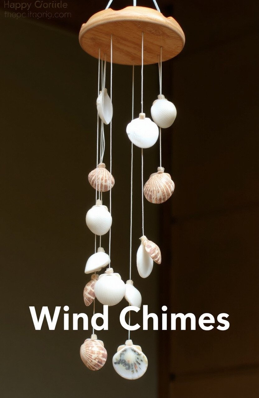Create soothing sounds with a shell wind chime. Use shells, strings, and a wooden base to assemble it. Drill small holes in the shells to thread the strings.