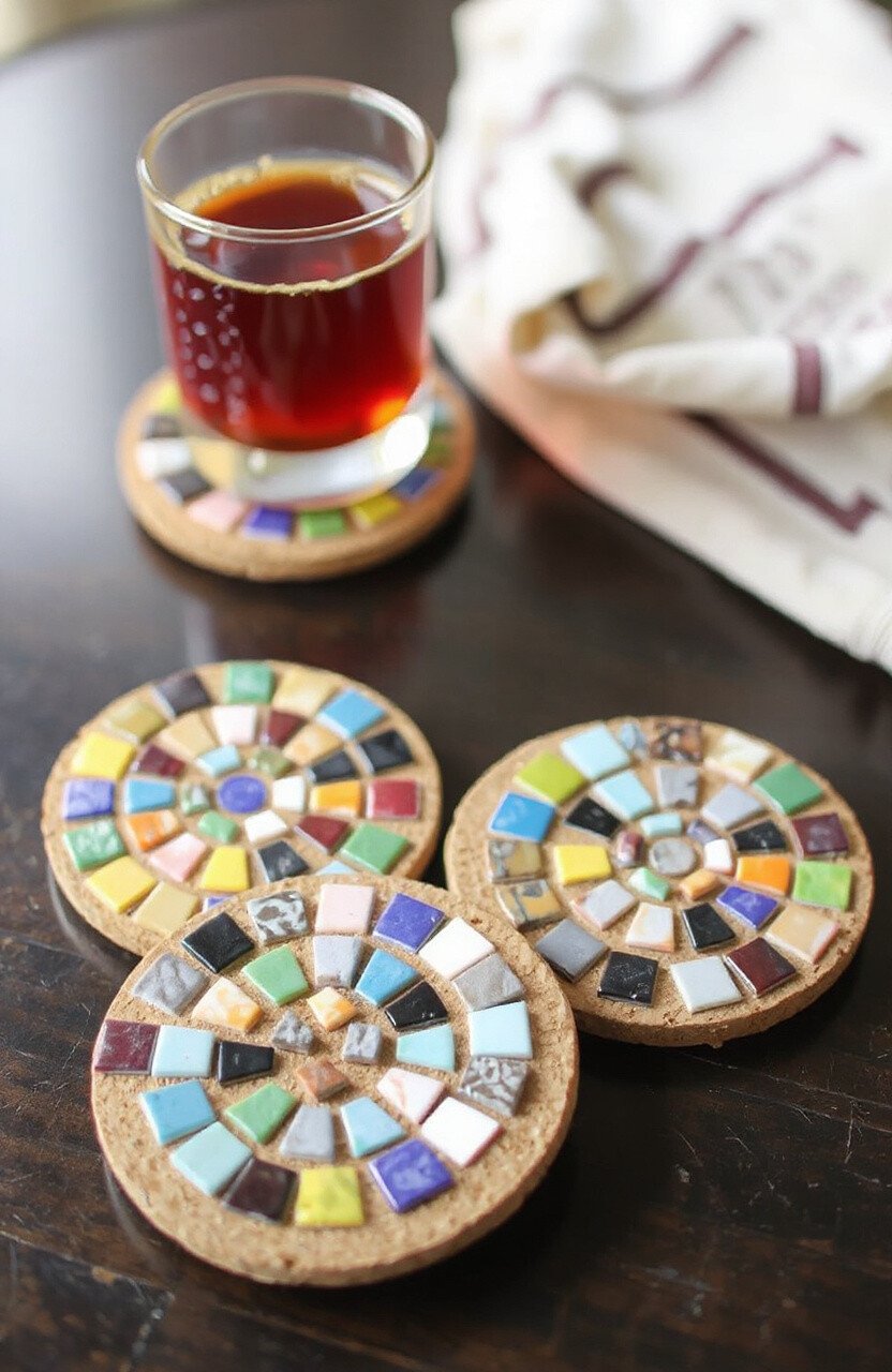 Craft colorful coasters using mosaic tiles. Arrange the tiles in patterns on a cork base and glue them down. Grout the gaps for a polished finish.