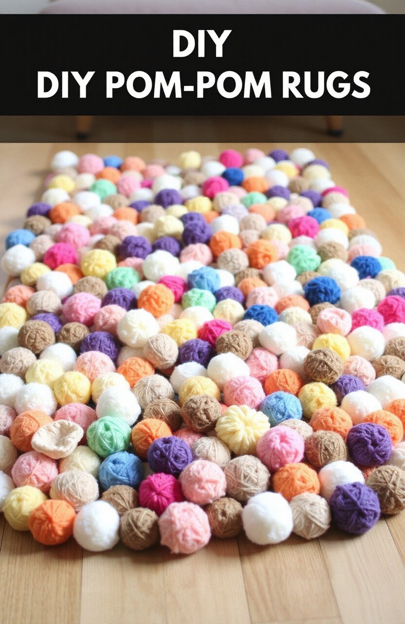 Make a cozy pom-pom rug using yarn and a rug mat. Create pom-poms in various colors and sizes and attach them to the mat. This craft is soft, colorful, and fun.