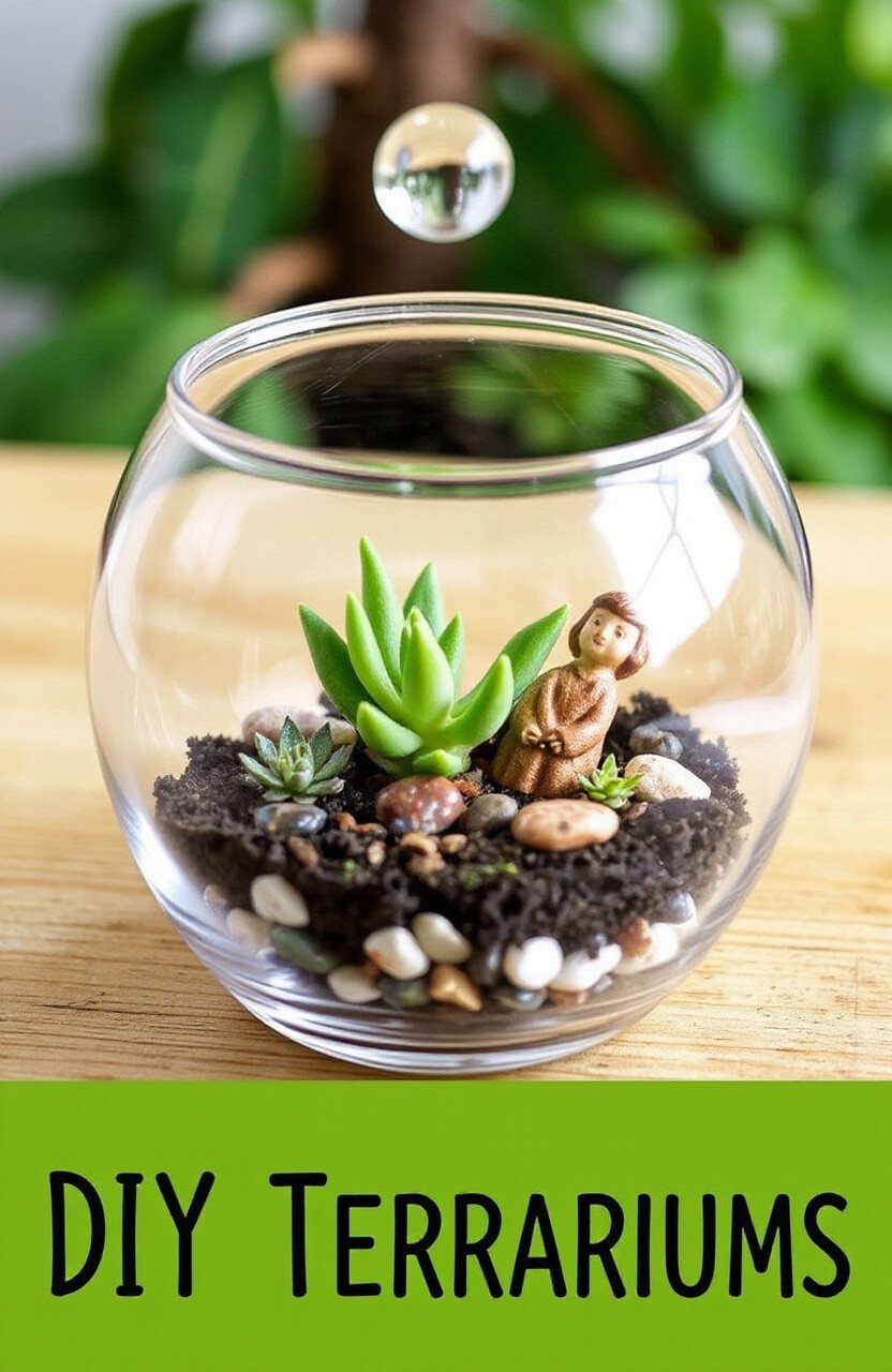 Create a miniature garden with a terrarium. Use glass containers, soil, and small plants like succulents. Decorate with tiny stones and figurines for added flair.