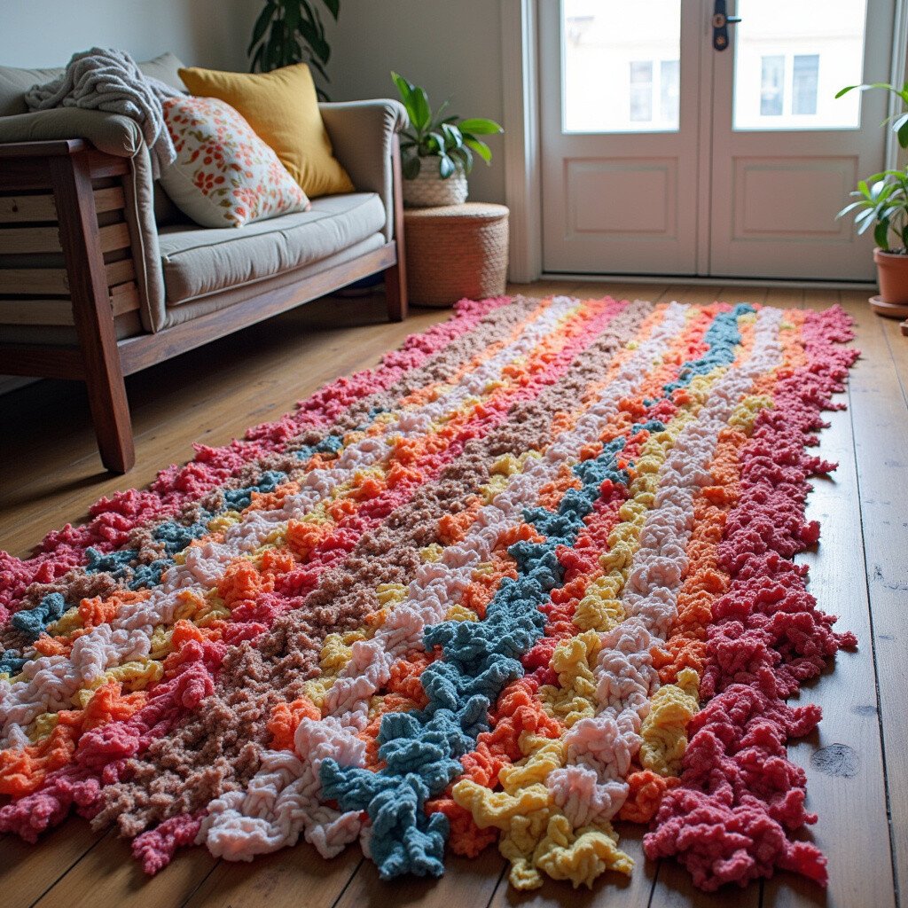 Choose fabrics with different textures and patterns for a unique look. Rag rugs are durable and can be customized in size to fit any space. It’s a sustainable project that turns clutter into cozy decor.