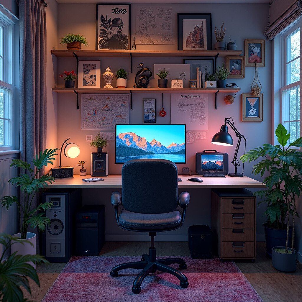 This setup is ideal for tech enthusiasts and digital creators. It’s a hub for innovative projects and learning new skills. Personalize with cool gadgets and smart lighting for a modern touch.
