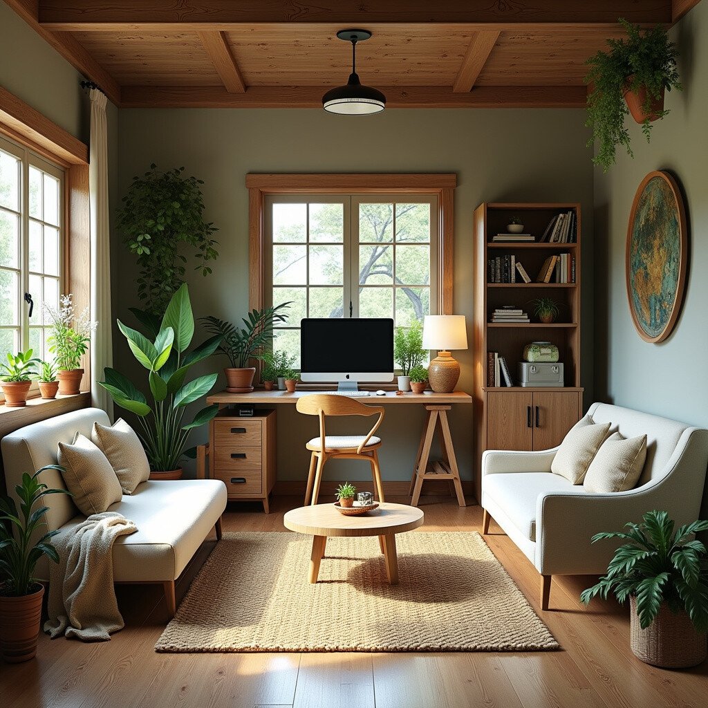 Bring the outdoors in with a nature-inspired hobby room. Use wooden furniture, leafy plants, and earthy tones.