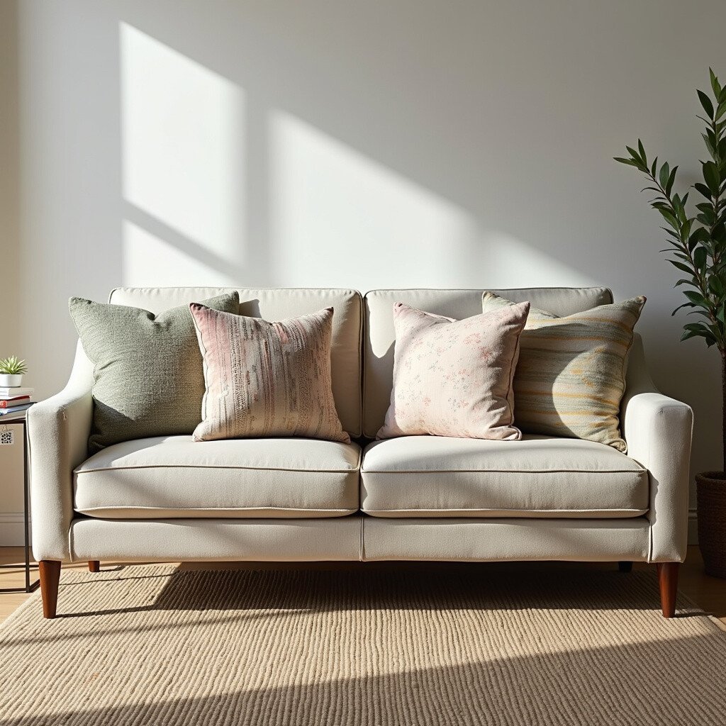 Mix and match fabrics for a unique touch. This is a great way to refresh your living room without spending a lot.