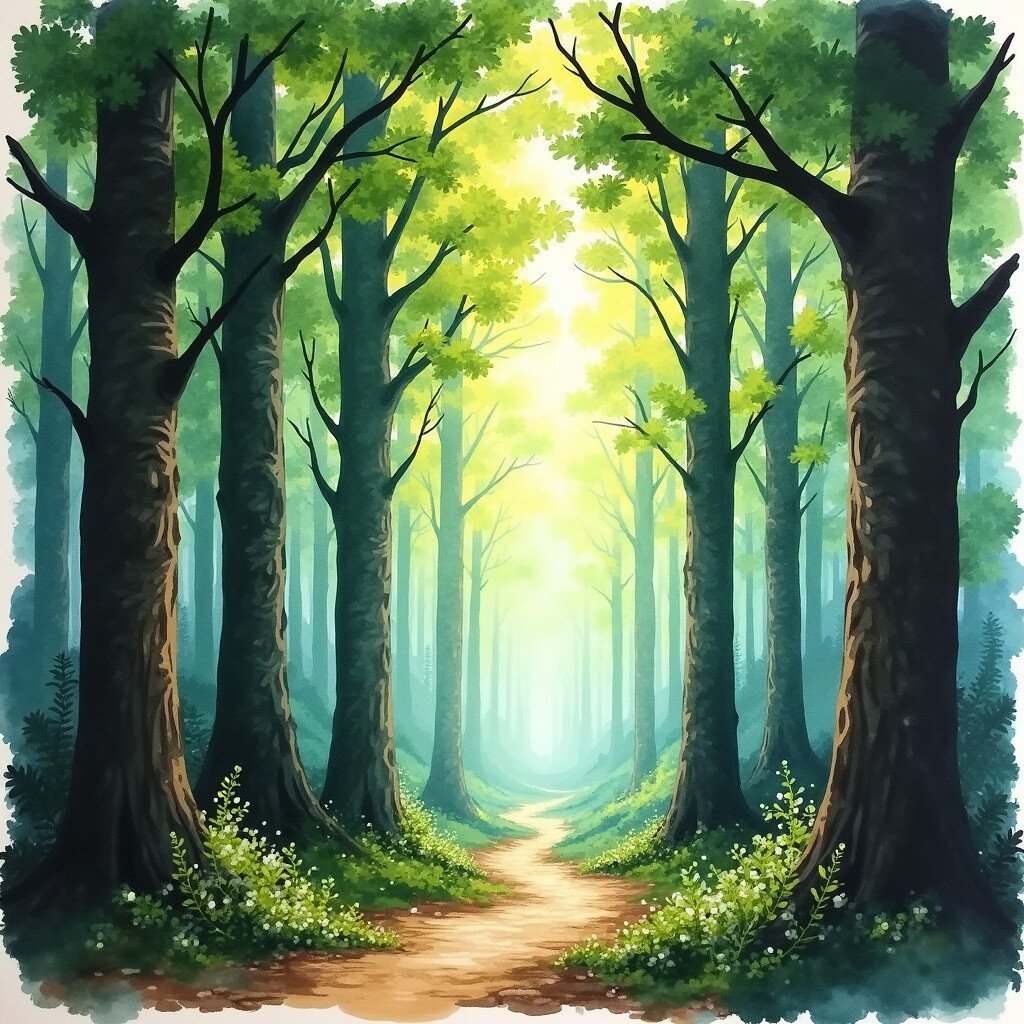 Forests are magical, and ink wash art can capture their mystery and depth. Imagine tall trees with dappled light filtering through the leaves.