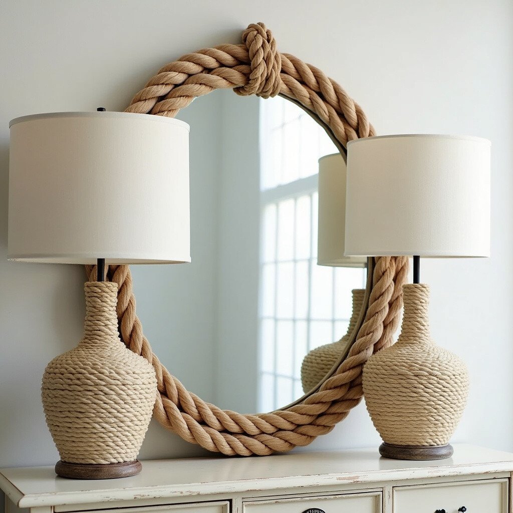 Nautical rope decor is versatile and stylish. Use it in mirrors, lamps, or as curtain tie-backs.