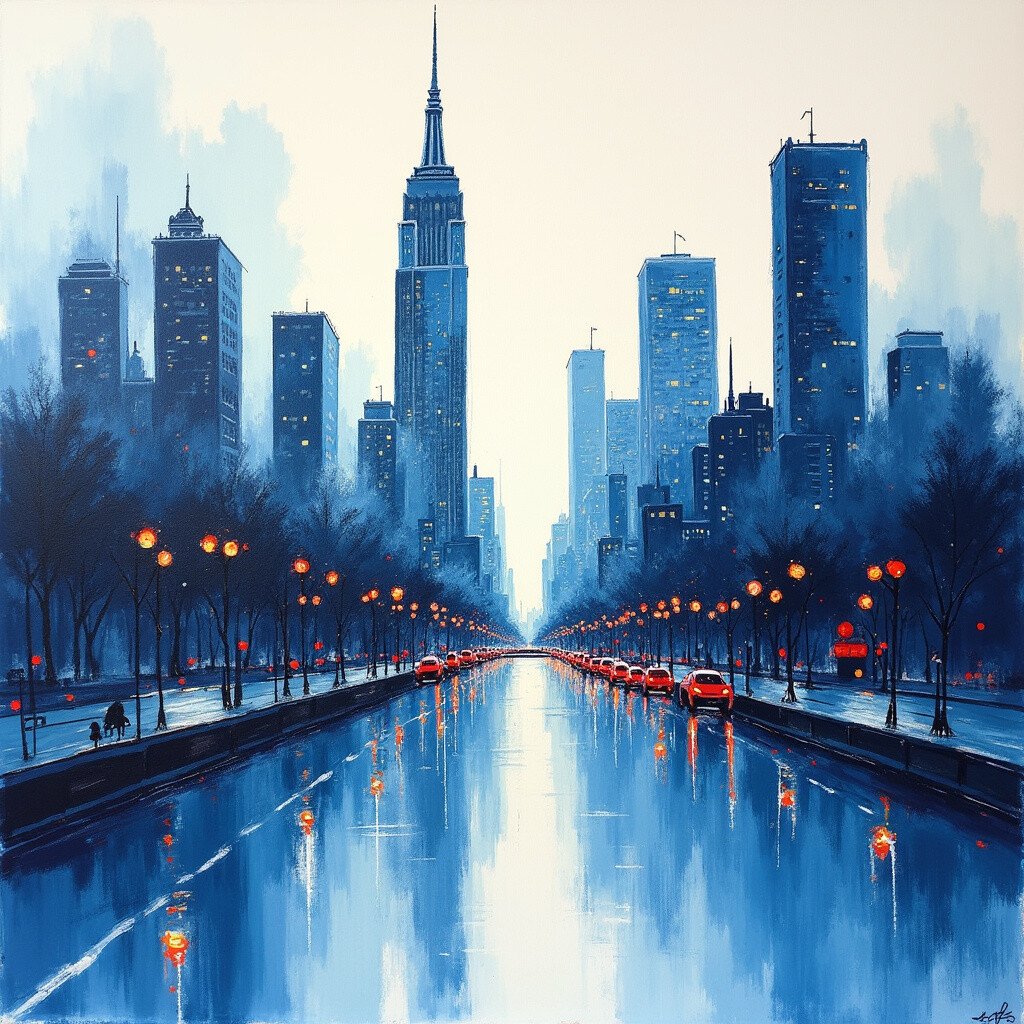 Craft a whimsical cityscape using shades of grey, blue, and pops of neon. Tall skyscrapers and bustling streets take form with simple finger strokes.