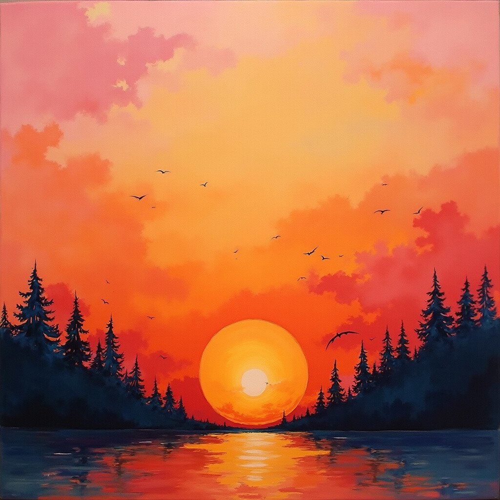 This painting brings a sense of calm and tranquility. Try adding silhouettes of trees or birds for a personalized touch.