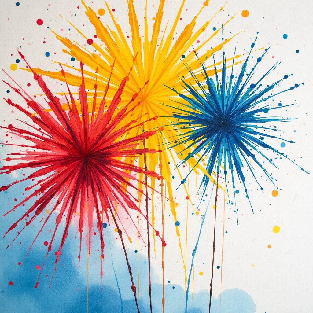 Celebrate any occasion with a burst of color by painting festive fireworks. Reds, yellows, and blues explode on the page, capturing the joy of a celebration.