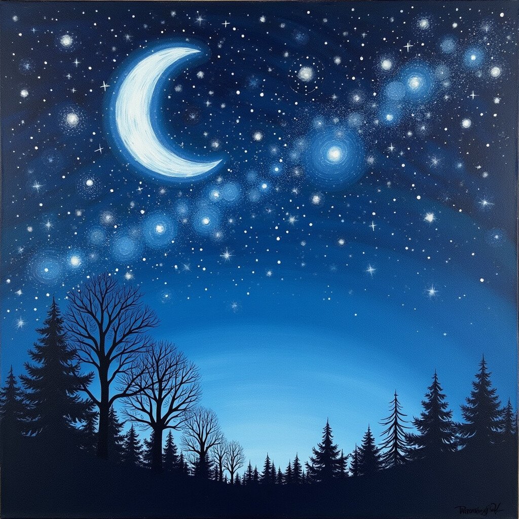Create a magical night sky filled with twinkling stars and a glowing moon. Use dark blues and blacks as your base, and add white and silver for the stars.