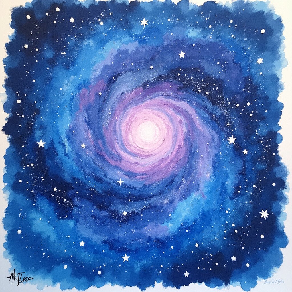 Imagine swirling your fingers through a galaxy of colors on paper. Create a mesmerizing abstract galaxy with shades of blue, purple, and hints of white stars. It’s a cosmic dance that feels liberating and serene.