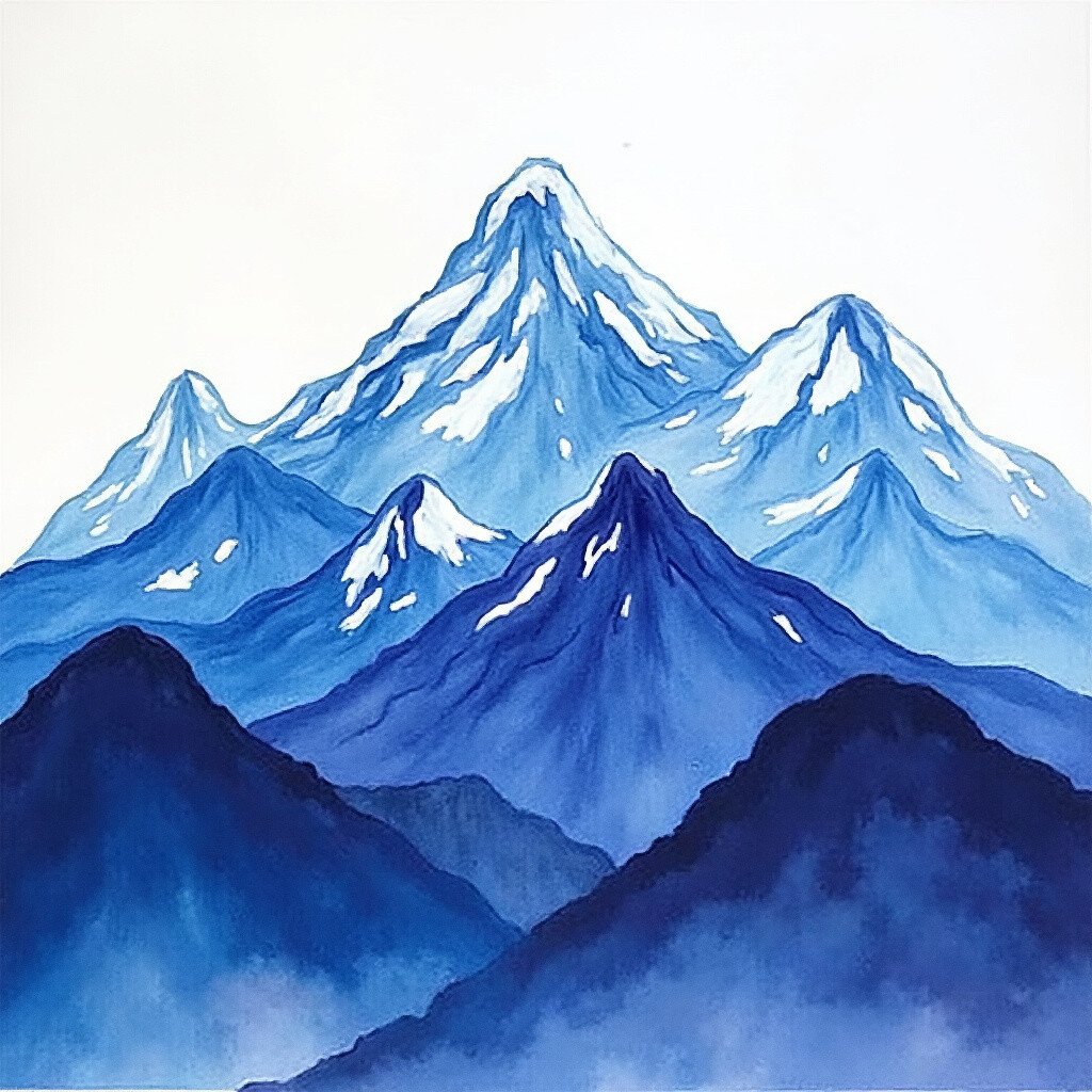 Create a majestic mountain range with deep blues and purples. Add white at the peaks to mimic snow-capped summits.