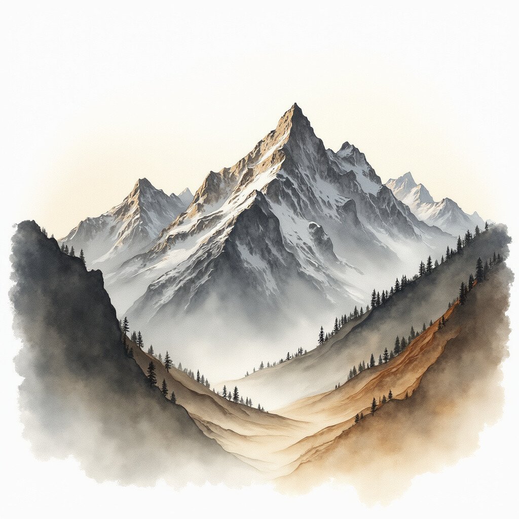 This method brings a sense of adventure and awe to your artwork. It’s affordable, with just sand and your watercolor kit needed. Personalize by adding snowcaps or experimenting with different shades of gray and brown for a dramatic effect.