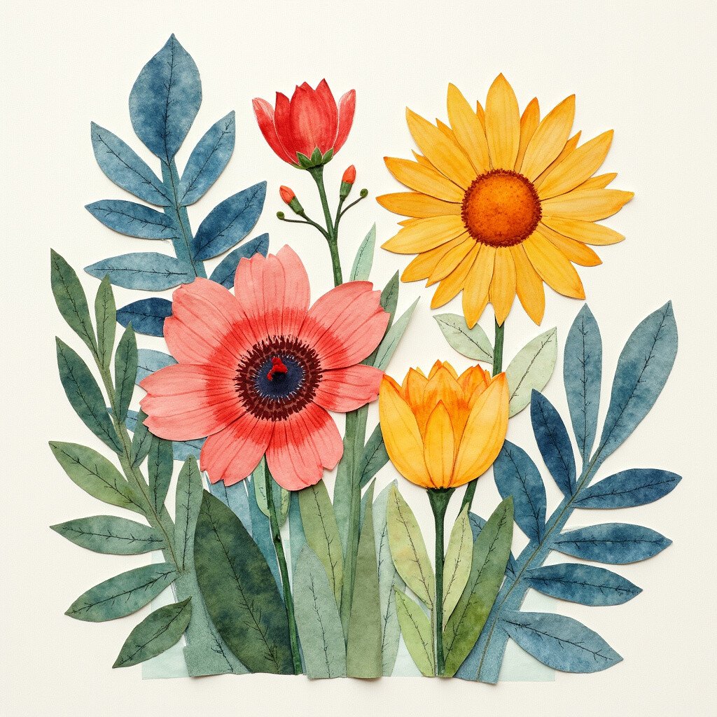 Combine different elements into a textured watercolor collage. By layering watercolor with paper cutouts, you create a multidimensional piece of art. The paper adds texture and depth, bringing each element to life.