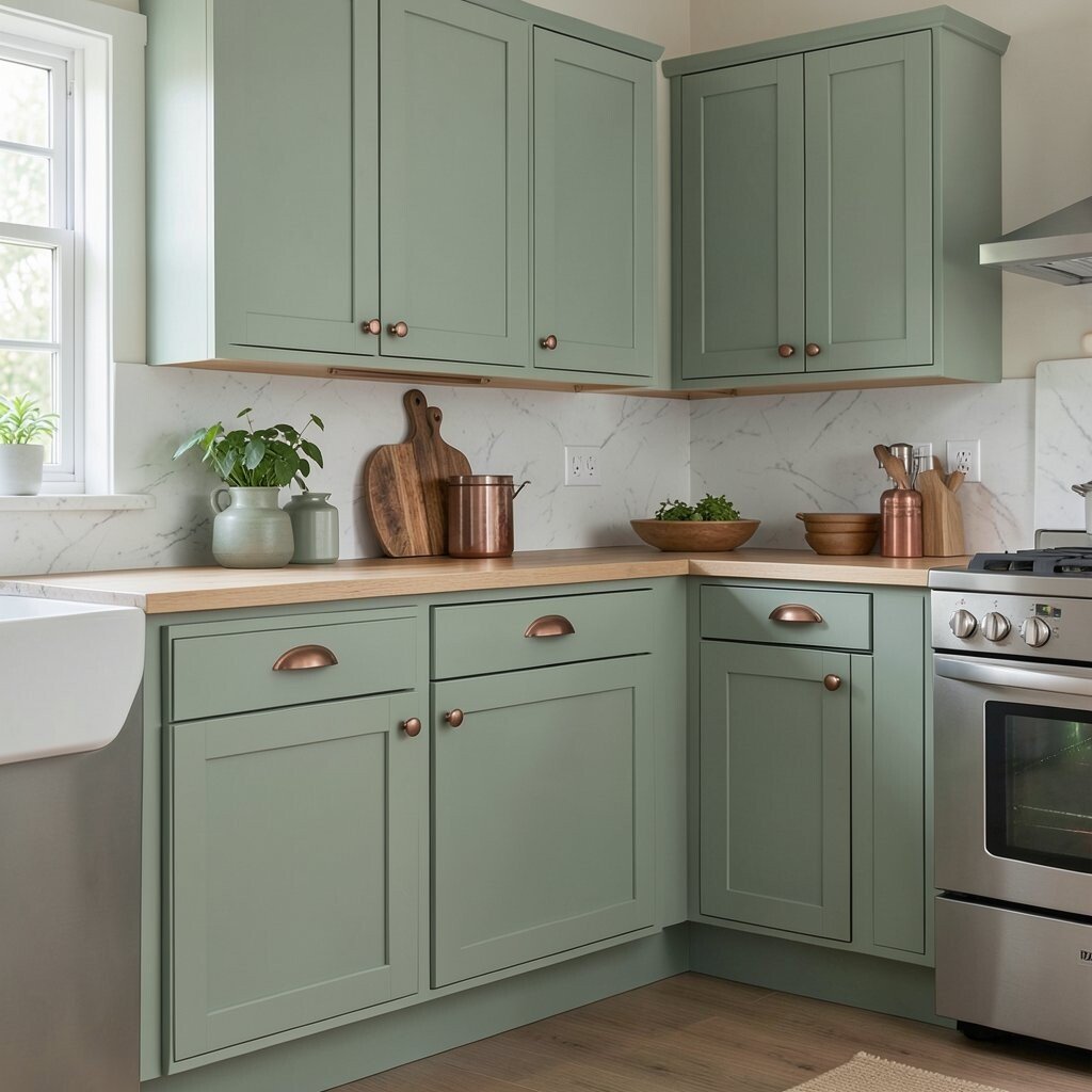 Sage green is a soothing and versatile option. It brings a sense of calmness to your kitchen and connects the indoors with the beauty of nature. This color feels fresh and earthy.