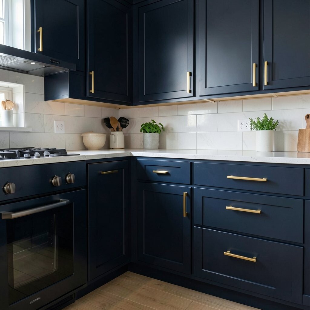 Pair navy cabinets with gold or brass hardware for a luxurious feel. It’s a trendy choice that stands out yet feels timeless. Imagine cooking in a space that feels like a modern masterpiece!