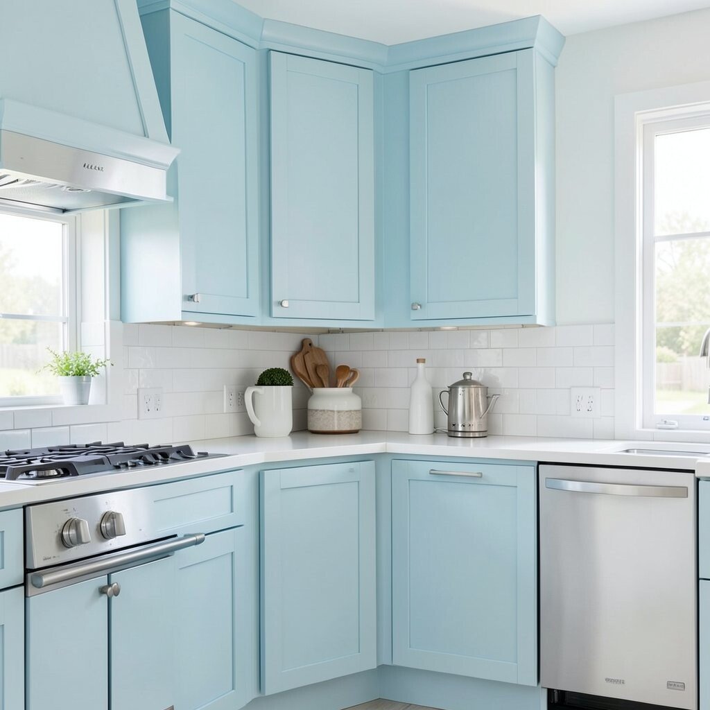 Sky blue is light, fresh, and airy. It creates a calming, serene atmosphere in your kitchen. This color is perfect for a breezy, relaxed vibe.