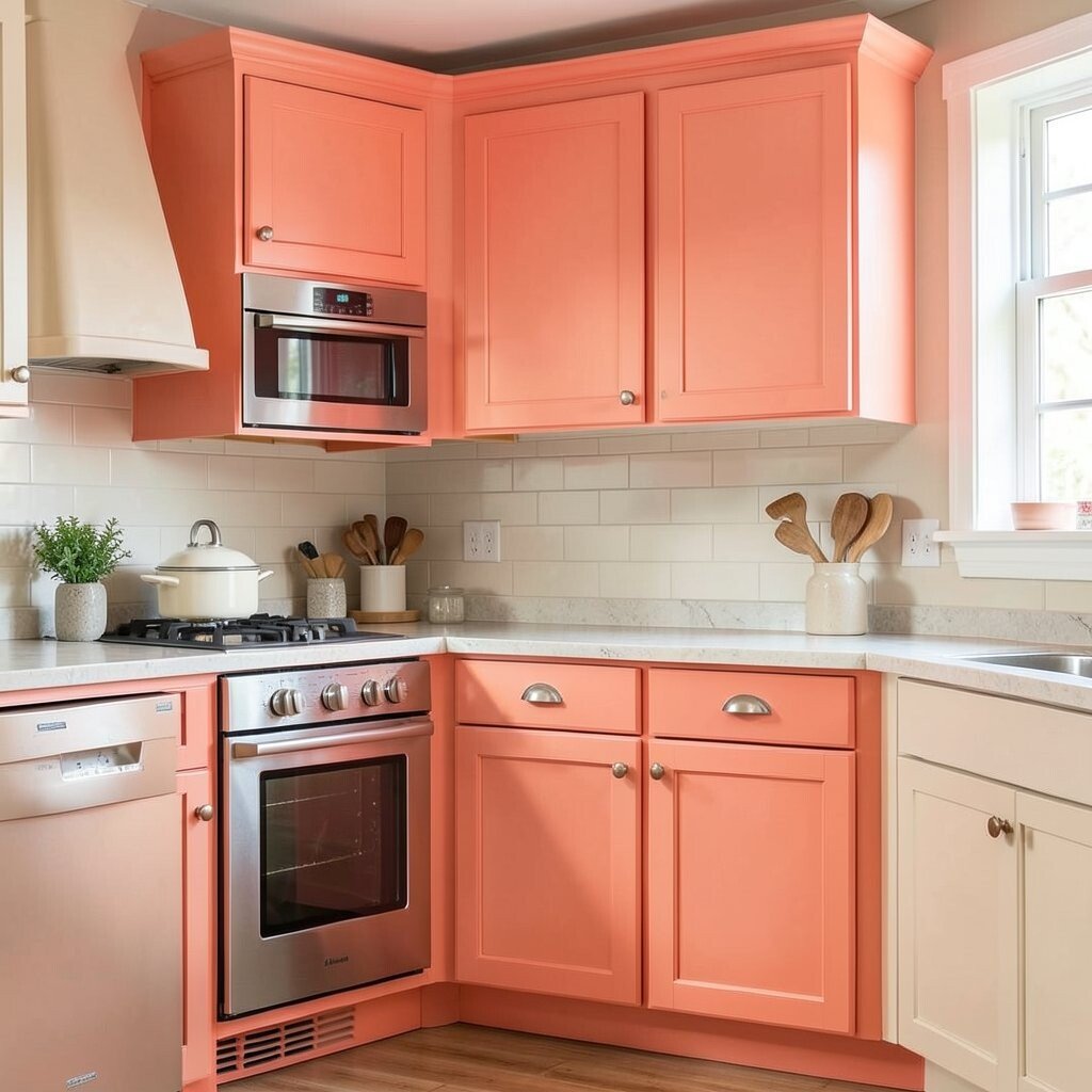 Pair coral with neutral tones to balance the brightness. It’s a bold choice that makes your kitchen feel warm and welcoming.