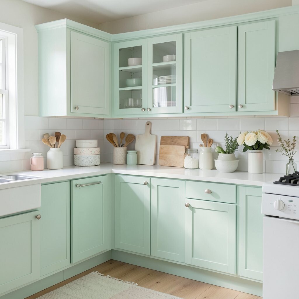 Mint green is fresh and playful. It adds a light, airy feel to your kitchen. This color is perfect for a fun and cheerful atmosphere.