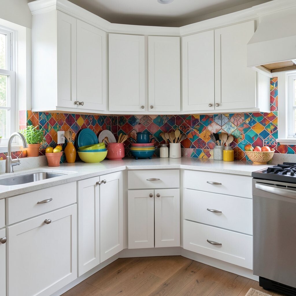 Pairing white cabinets with bold-colored accessories can create a stunning contrast. Try adding a splash of color with bright dishware or a vibrant backsplash. The best part? White matches everything!
