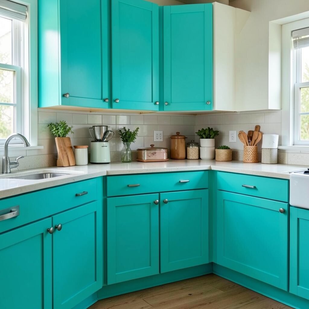 Pair turquoise with neutral tones to balance the vibrancy. It’s a bold choice that adds a unique and personal touch to your kitchen.