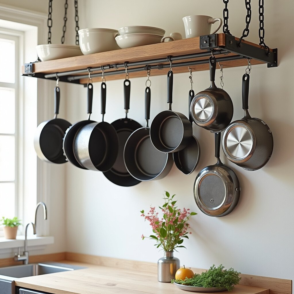 A hanging pot rack is like a chandelier for your pots and pans. It’s a stylish way to keep your cookware at arm’s reach. With options in metal, wood, or even a vintage ladder style, it can match any kitchen vibe.