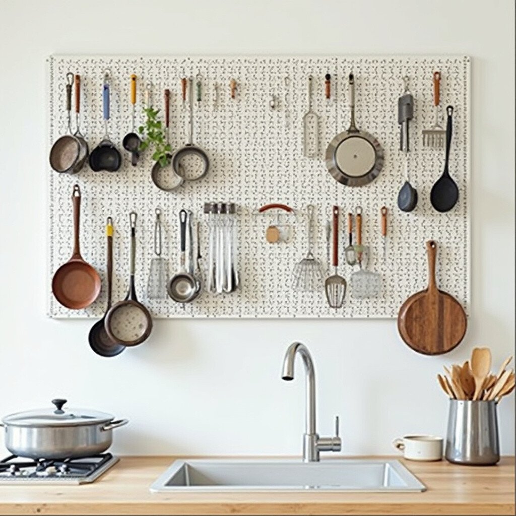 A pegboard wall is like a blank canvas for your kitchen tools. Hang pots, pans, and utensils in a way that’s both functional and artistic. It’s a great option for those who love to switch things up often.