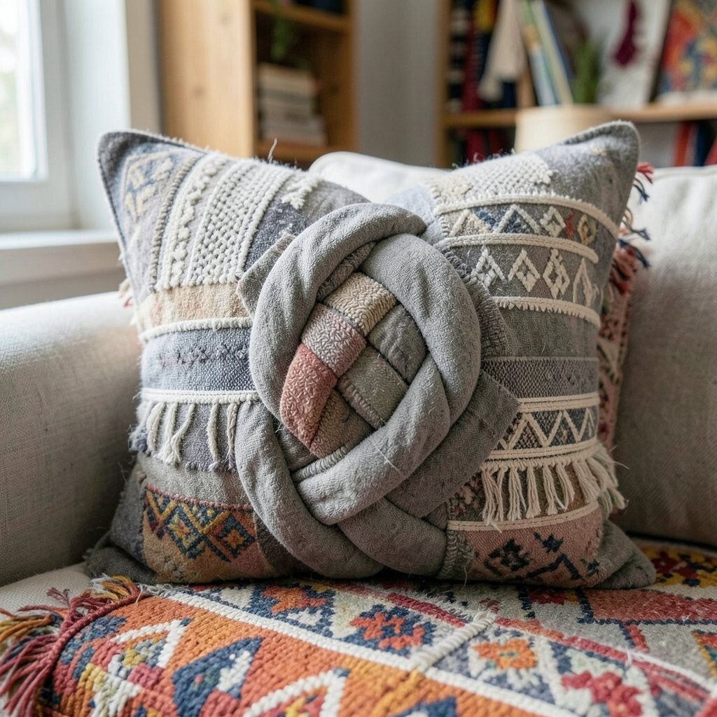 Embrace your free spirit with a bohemian knot pillow. This design involves using various textures and patterns for a unique look. Use grey fabric with different patterns to create a boho-chic pillow.