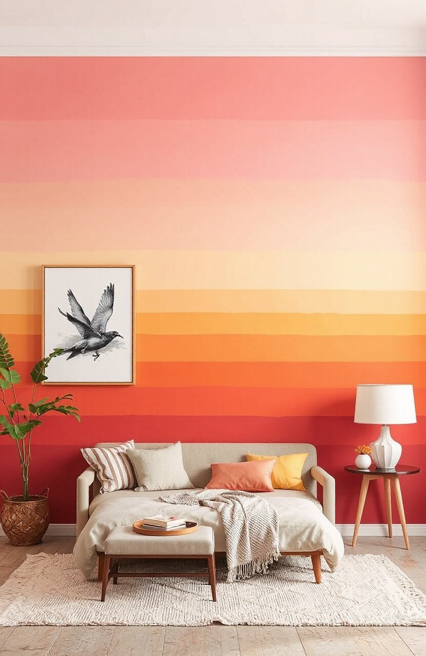 Bring the beauty of a sunset into your home with ombre walls. This technique gradually blends colors like a sunset, from deep oranges to soft pinks. It’s like living in a never-ending golden hour.