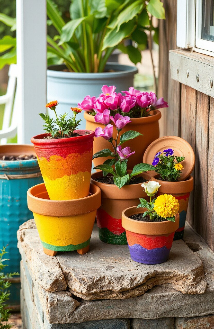 Bring life to your garden with color-layered pots. Paint terracotta pots in layers of vibrant colors to brighten up your outdoor space.