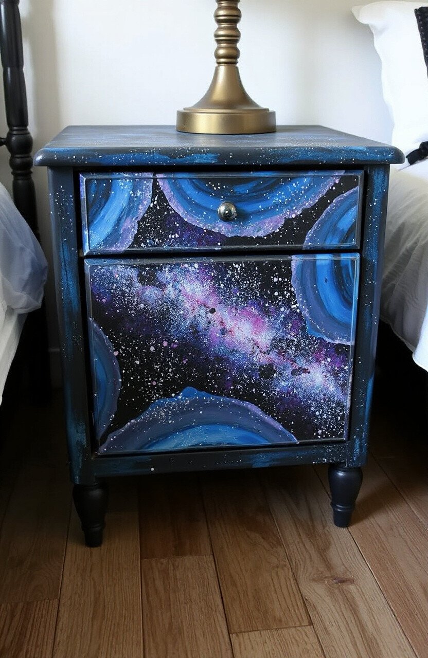 Bring the cosmos into your bedroom with a galaxy nightstand. Layer blues, purples, and blacks, then add specks of white for stars. It’s like having a piece of the universe by your bed.