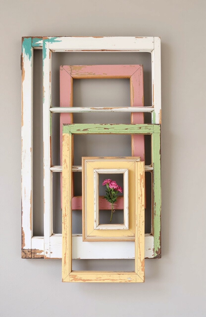 Add layers of paint to old window frames. Use bright colors for a cheerful effect. It’s a quirky addition to any space.