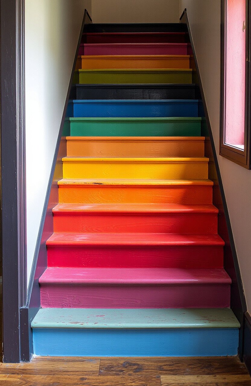 Make your staircase a standout feature with layered stripes. Use a variety of colors for each step. It’s like walking on a rainbow every day.