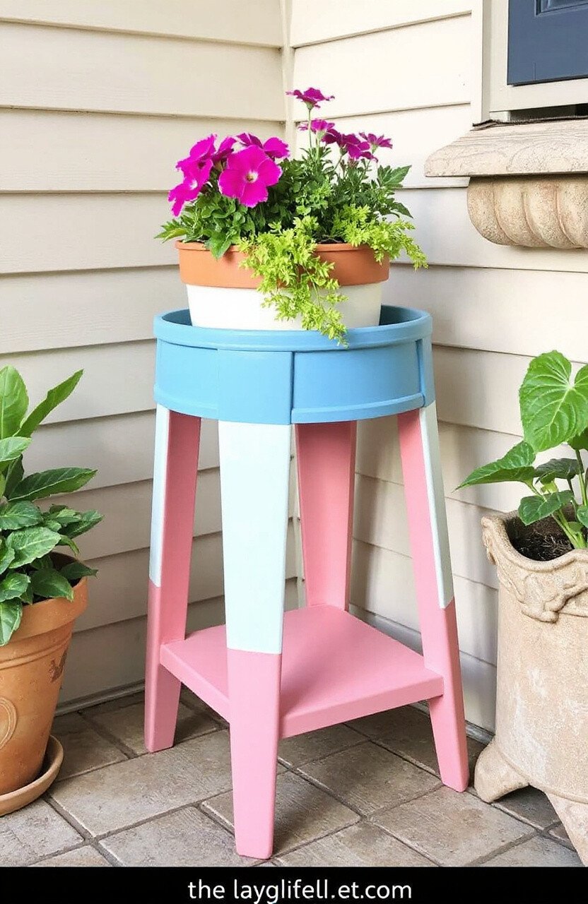 Layer paint on a plant stand for a burst of color. It highlights your plants with style. Perfect for adding interest to a corner.
