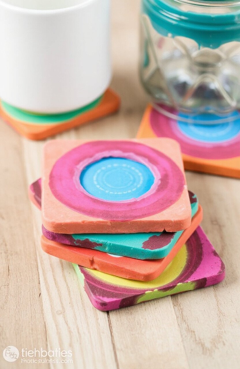Paint layers of color on coasters. The result is a set of vibrant, unique pieces. It’s a fun project for entertaining guests.