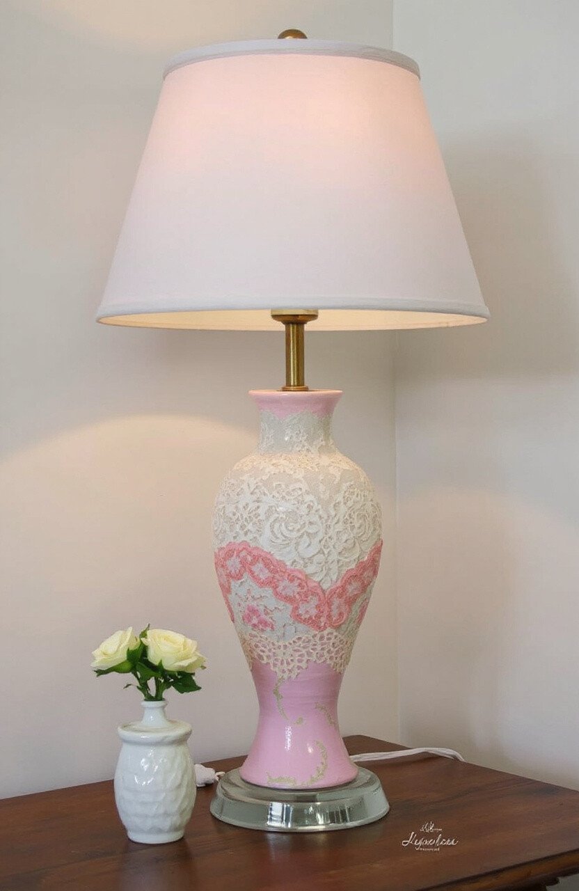 Add layers of lace and paint to a lamp base for a vintage feel. The combination of textures and colors creates a charming, cozy atmosphere.