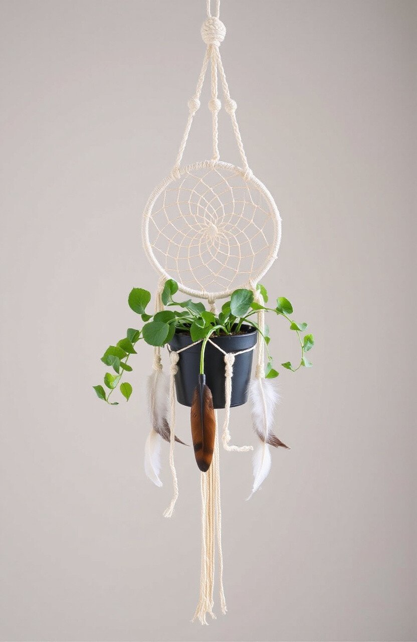 Combine two crafts in one with a macrame dreamcatcher hanger. This design merges the beauty of dreamcatchers with the functionality of a plant hanger. It’s perfect for creating a whimsical, bohemian vibe.