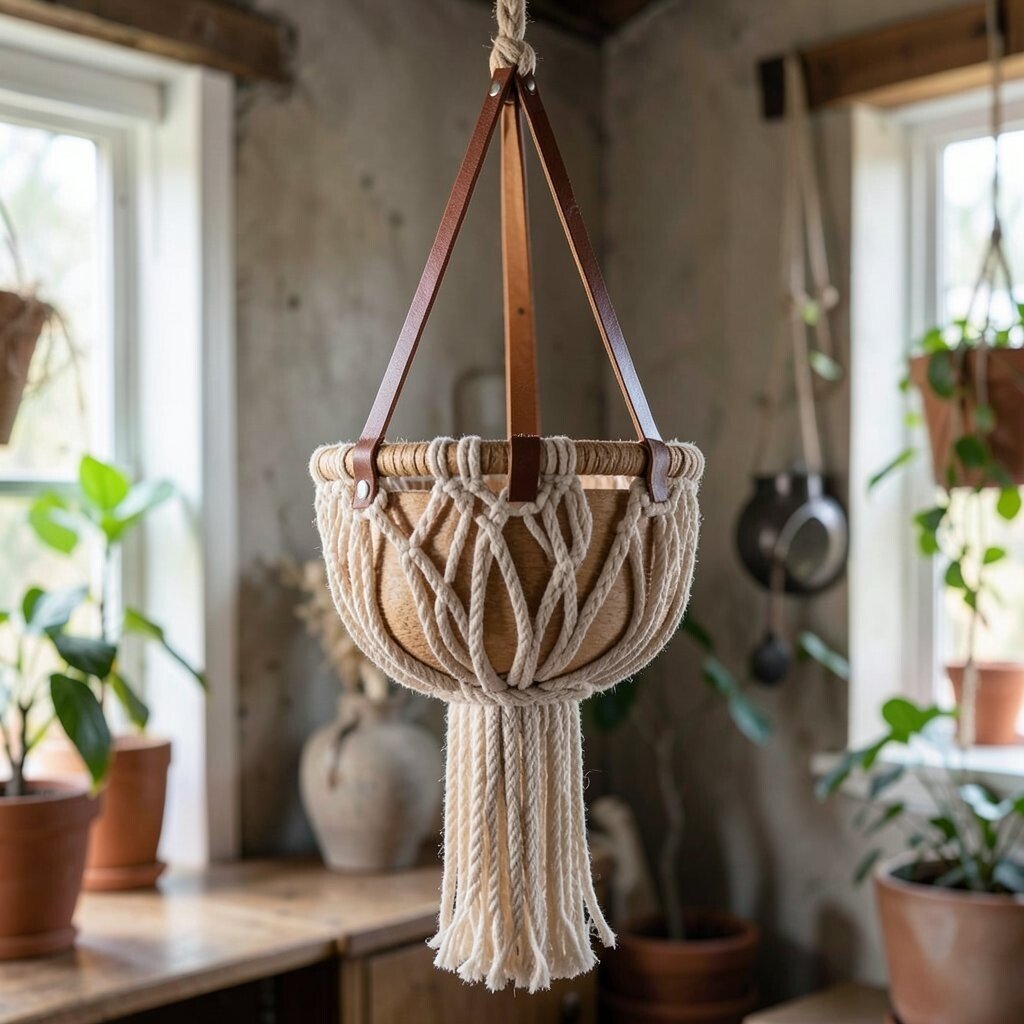 Incorporate a touch of leather for a unique twist on the traditional macrame hanger. The combination of leather and rope adds texture and interest, perfect for rustic or eclectic spaces.