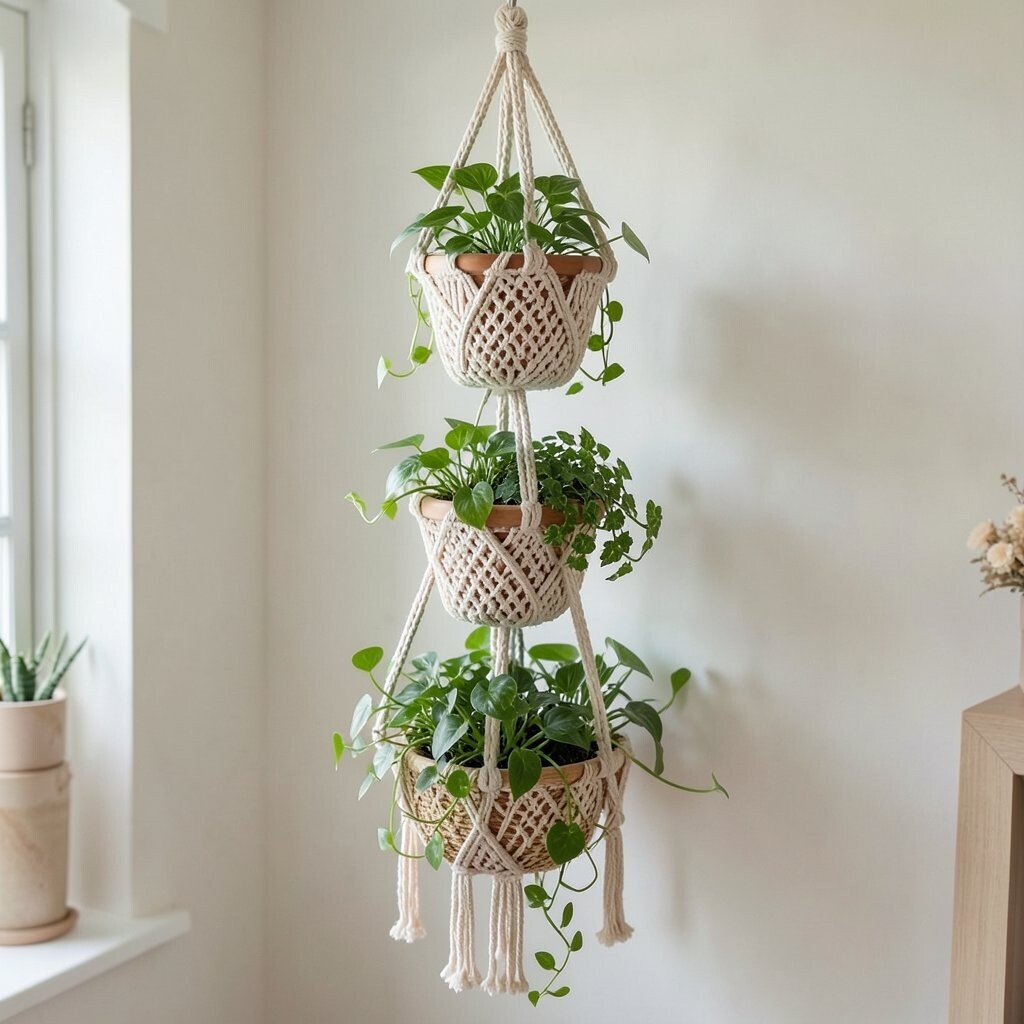 Tiered macrame hangers let you stack multiple plants vertically. This design is perfect for creating a cascading green effect, adding depth and dimension to your space. It’s a great option for displaying a variety of plant types.