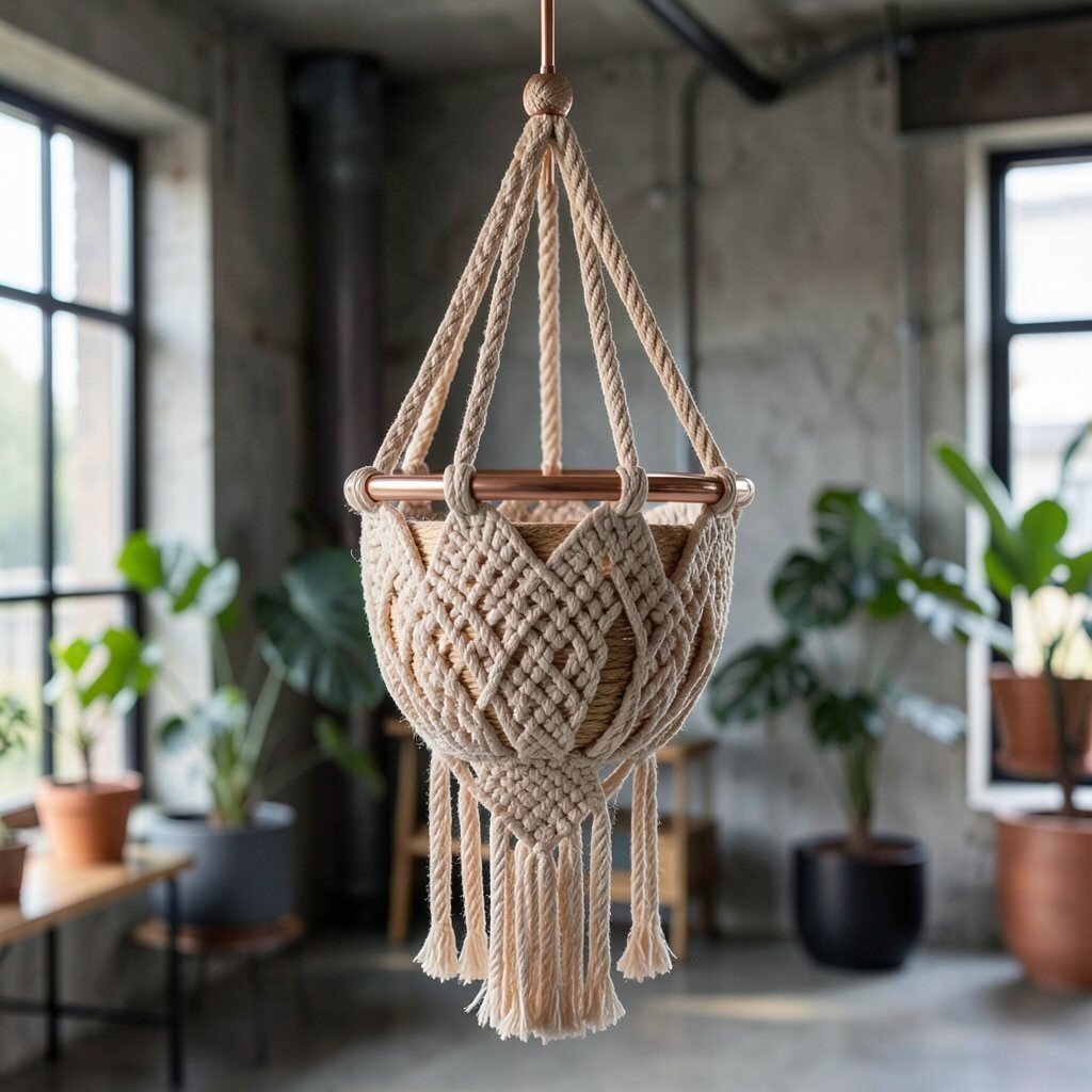 Add a touch of elegance with a macrame hanger featuring copper accents. The combination of copper and rope creates a chic, sophisticated look, perfect for modern or industrial spaces.