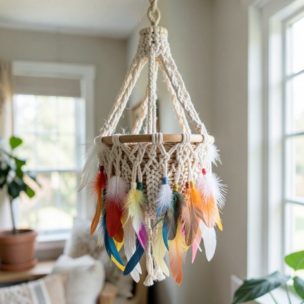 Add a touch of whimsy with a macrame hanger adorned with feathers. This design is perfect for adding a boho or eclectic vibe, creating a light and airy feel in your space.