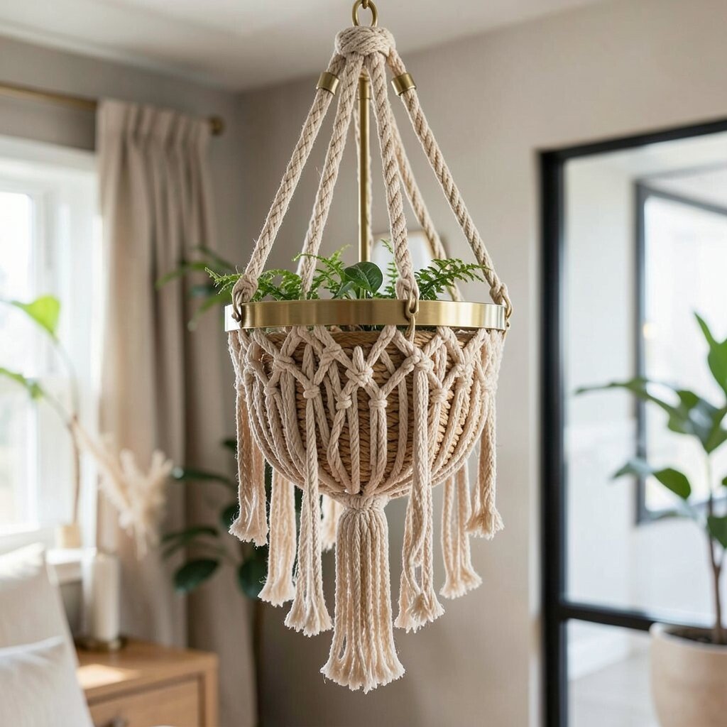 For a touch of luxury, try a macrame hanger with brass elements. The combination of brass and rope creates a sophisticated look, perfect for high-end decor.