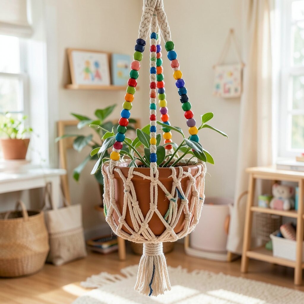 For a splash of color, a beaded macrame hanger is your go-to. Vibrant beads woven into the ropes add a playful and cheerful vibe to your space. Choose beads in colors that match your room’s theme for a cohesive look.