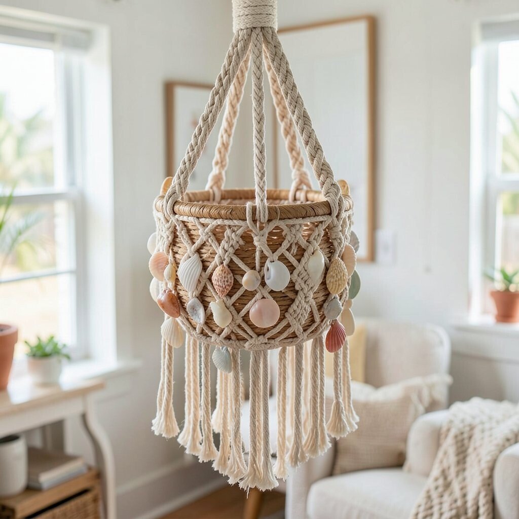Bring a touch of the beach to your home with a macrame hanger adorned with shells. This design is perfect for a coastal or nautical theme, adding a breezy, relaxed vibe to your space.