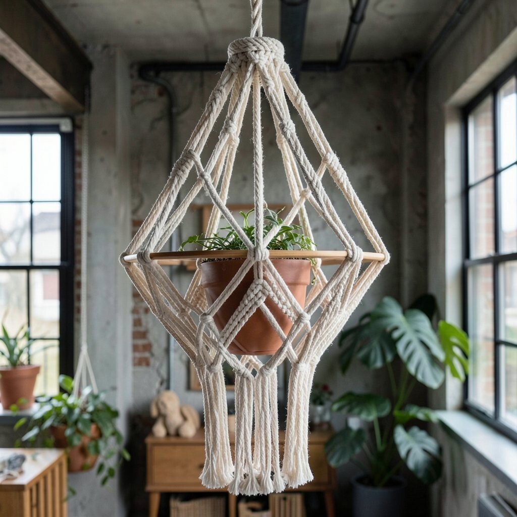 For a modern twist, try a geometric macrame hanger. The angular design adds a contemporary edge, perfect for modern or industrial spaces. These hangers make a bold statement and add visual interest.