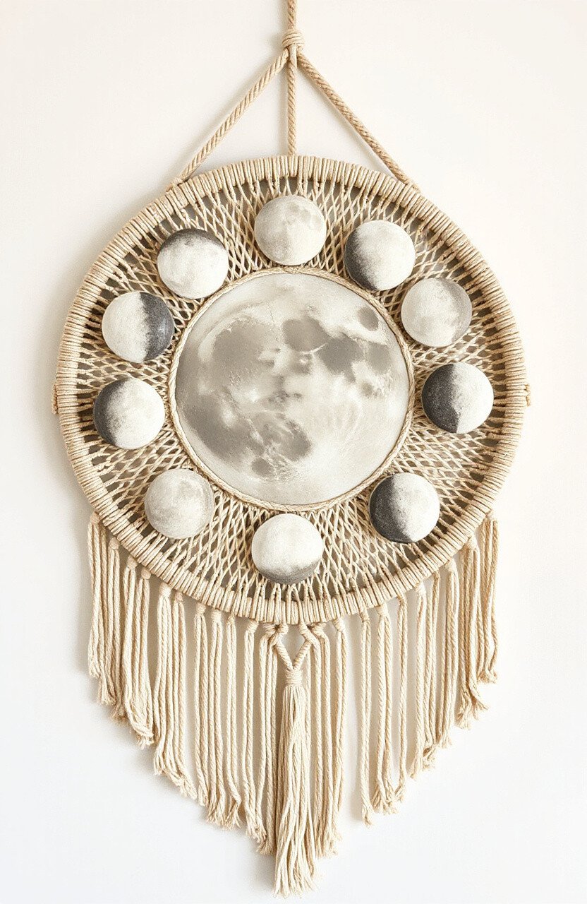 Capture the magic of the moon with a macrame wall hanging that depicts its phases. This piece brings a sense of wonder and tranquility to any room.