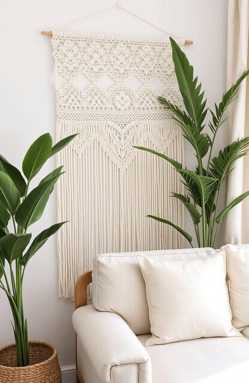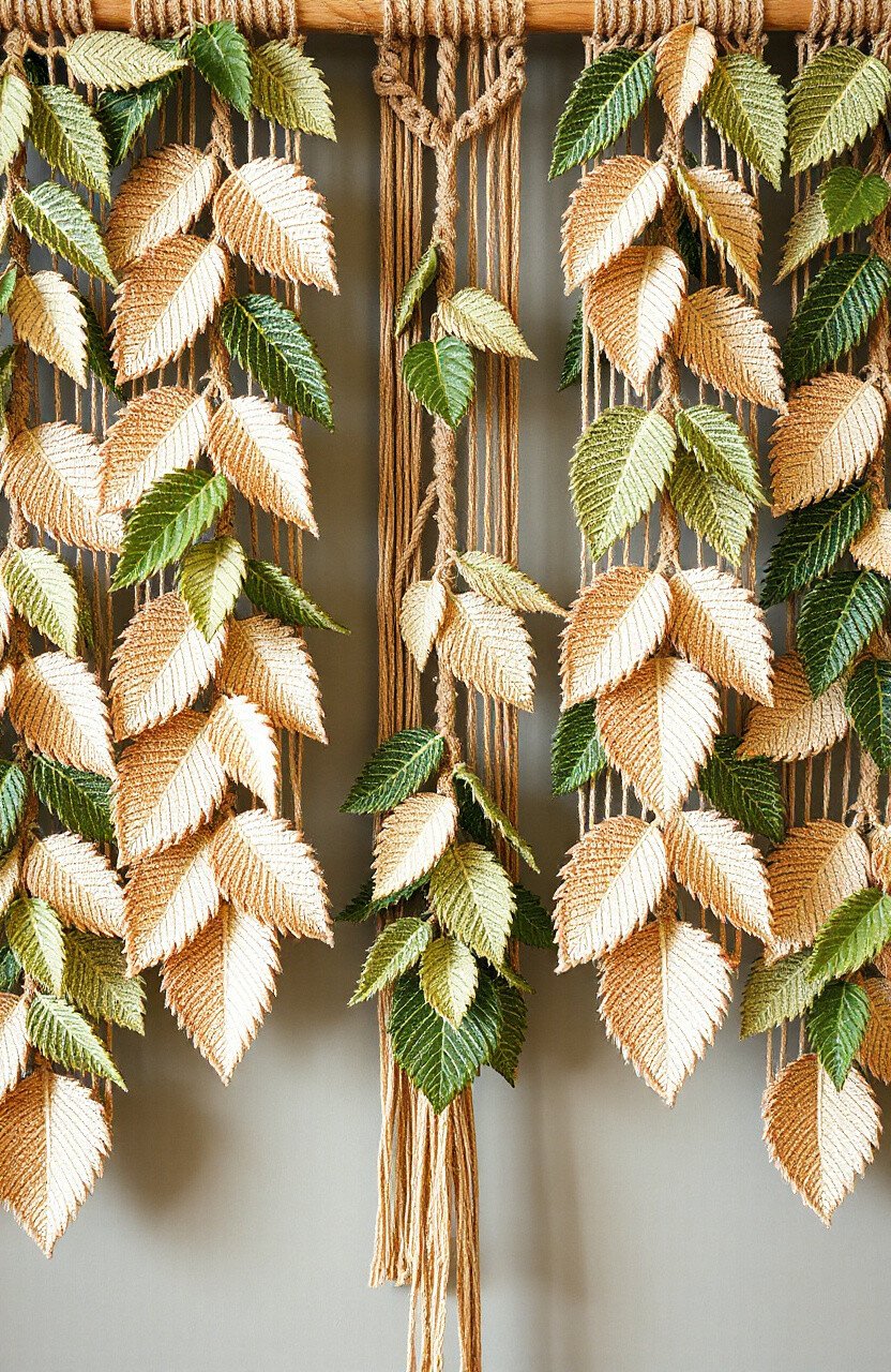 Bring the outside in with a macrame wall hanging that mimics the delicate shapes of leaves. The natural, earthy tones make it a versatile addition to any space. This design is perfect for adding a touch of nature without the maintenance of real plants.