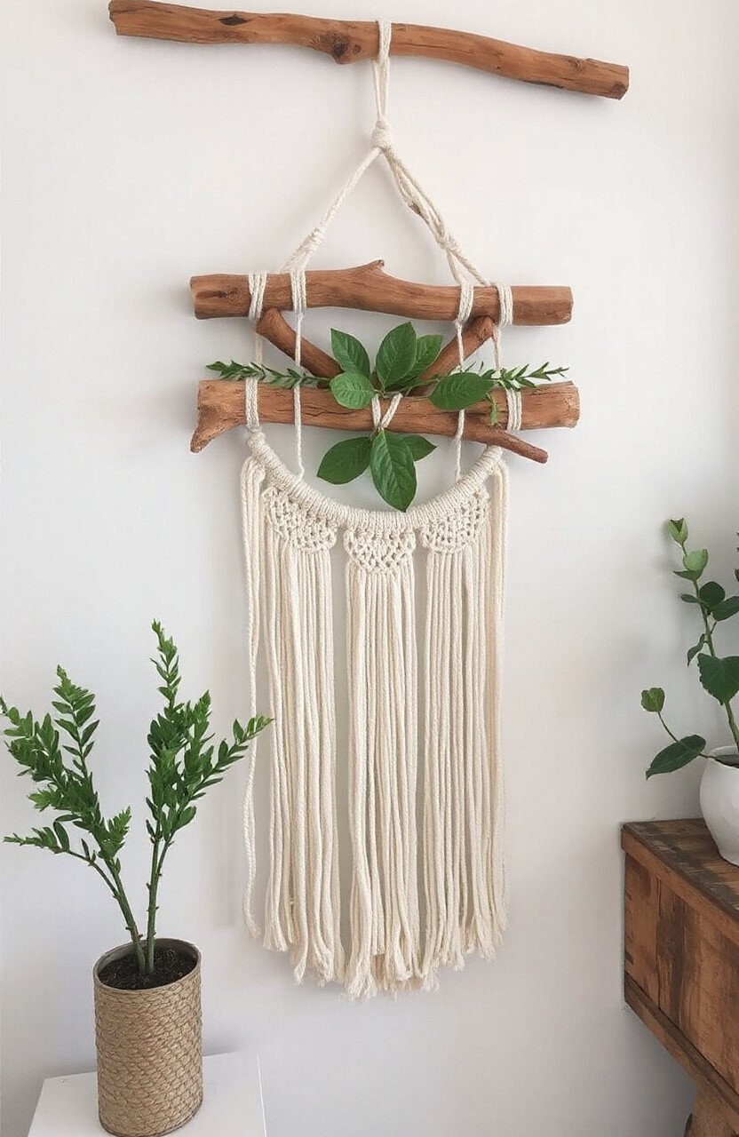 Combine the natural beauty of driftwood with macrame for a truly rustic piece. The wood adds a unique, earthy element that pairs beautifully with the softness of the macrame.