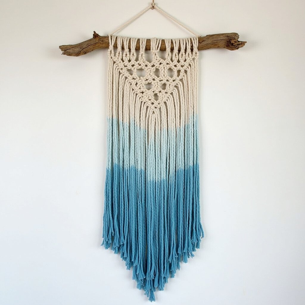 Feel the gentle caress of the sea with the Ocean Breeze Macrame. This piece captures the essence of coastal tranquility with blue and white threads cascading from a rustic piece of driftwood. It’s perfect for creating a calm space in any room.